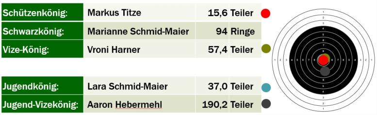 Schützengesellschaft “Edelweiß” Puch e.V.Aktuelles 2022/23RWK 5. RundeB-Klasse:Puch 2 : Landsberied 3 - 1423 : 1365Jugend: Puch : Überacker - 749 : 740Unsere Könige 2022Weihnachtsfeier 2022Am Freitag den 16. Dezember 2022 fand unsere diesjährige Weihnachtsfeier in Kombination mit einem weihnachtlichen Preisschießen und unserer Königsproklamation statt. Nach einem gemeinsamen Essen durfte jeder der insgesamt dreißig Teilnehmer sein Glück am Schießstand auf weihnachtliche Glücksscheiben unseres elektronischen Schießstandes versuchen. Zurück im Stüberl folgte ein kurzer besinnlicher Teil und anschließend die Preisverteilung. Das Preisschießen gewann Eleni Stergiou mit der maximal möglichen Punktzahl von 320 Punkten, gefolgt von Marianne Schmid-Maier und Christina Kuijper (jeweils 300 Punkte), Franz Lengenfelder (295 Punkte) und Theo Bärmann (285 Punkte).Weihnachtsfeier verschobenAus organisatorischen Gründen musste unsere ursprünglich für den 02. Dezember geplante Weihnachtsfeier verschoben werden. Neuer Termin ist: Freitag, der 16. Dezember 2022 Nach einem gemeinsamen Essen um 19 Uhr folgt ein weihnachtliches Preisschießen und die Königsproklamation.Am 02. Dezember findet ein normaler Schießabend mit Stüberlbetrieb statt.RWK 4. RundeGauliga: Olching 3 : Puch 1 - 1466 : 1442B-Klasse:Puch 2 : E-Puchheim 2 - 1402 : 1361 Jugend: Nannhofen : Puch - 624 : 754Altpapier-Sammlung am Samstag, den 03. Dezember 2022Die nächste Altpapier-Sammlung unseres Vereins findet turnusmäßig am Samstag, den 03. Dezember, statt. Wie gewohnt, bitte das Altpapier gebündelt am Straßenrand ab 09:00 Uhr bereit legen. Vielen Dank!RWK 3. RundeGauliga: Puch 1 : Althegnenberg 1 - 1478 : 1429B-Klasse:Althgenenberg 2 :Puch 2 - 1304 : 1378Jugend: Aufkirchen : Puch - 812 : 751RWK 2. RundeGauliga: Mittelstetten : Puch 1 - 1471 : 1484Jugend: Puch : Schöngeising - 742 : 731RWK 1. RundeGauliga: Puch 1 : Egenhofen 1 - 1432 : 1372B-Klasse:Oberweikertshofen : Puch 2 - 1442 : 1328 Jugend: Oberschweinbach : Puch - 605 : 745Saisonstart 2022/23Los geht’s am Freitag, den 16. September 2022, mit’m Anfangsschießen der Jahresmeisterschaft.Aktuell sind keine Corona-Beschränkungen vorgesehen, so dass das Schießen wieder ohne Voranmeldung möglich ist. Die Schießabende finden jeden Freitag für die Jugend (ab 18.30 Uhr) und Allgemeinheit statt. Notwendige Änderungen sind aus dem nachfolgenden Programm ersichtlich.21.10.2022Königsschießen (kombiniert mit Jahresmeisterschaft) 28.10.2022Königsschießen (kombiniert mit Jahresmeisterschaft) 02.12.2022Weihnachtsschießen mit Königsproklamation ab 19.00 Uhr gemeinsames Essen, anschließend Preisschießen und Königsproklamation 23.12.2022Schießabend entfällt.30.12.2022Schießabend findet statt. 06.01.2023Schießabend entfällt.